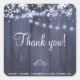 Editable text favor sticker featuring rustic white snowflakes, three small hearts and twinkle hanging lights with a white editable thank you script on dark blue grey barn wood background. Ideal for your winter elegant rustic seasonal wonderland themed wedding, baby shower or other occasions.