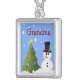 This adorable necklace and pendant features a wintry Christmas scene of a snowman wearing a big black top hat. Snowman has eyes made out of coal and a carrot nose. Out in the this snowy scene with the snowman is a Christmas tree all decorated for Christmas. This scene is set to a sky blue background with white snow falling. Above the snowman and Christmas tree is text that says Grandma in red font, however this text can be changed to whatever you wish. Personalize this pendant to say Mother, your best friends name, your name, a child's name, etc.