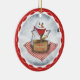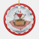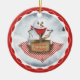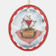 Watercolor style snowman picnic Christmas holiday tree ornaments for foodies or folks who love snowmen. He wears a napkin, opening a picnic basket on a red checkered or gingham blanket in a snowy blizzard, perfect snowman weather!
