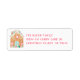 This return address label features a gingerbread house decorated with pink and aqua candies.