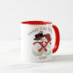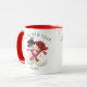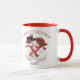 This adorable design features a vintage style, snowman and snow-woman wearing red scarves holiday hats. The text on the right reads "MERRY CHRISTMAS", in red. On the left side the text reads "HAPPY NEW YEAR". This rim and handle on this mug come in ten colors (red shown here).