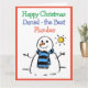 Happy Christmas to a Plumber. Funny cartoon of a snowman in the winter sun. Add a message from the sender.