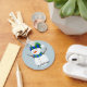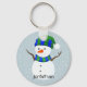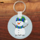Snowman Design Keychain, featuring a cute snowman on a blue snowy background and customizable text.
