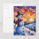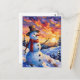 A detailed scene of a cheerful snowman standing proudly in a field, adorned with a cozy scarf and carrot nose, with a backdrop of a vibrant sunset casting warm, rosy glow across the snowy landscape. The rich palette blends warm oranges, deep reds, and soft purples in the sky, contrasting with the cool blues and crisp whites of the snow. Brushstrokes are expressive yet controlled, capturing the joy and unique character of the snowman.