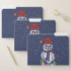 This set of three file folders have a happy snowman wearing a blue and red matching hat and scarf holding a brightly lit string of Christmas lights on a dark blue background with falling snow.