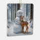 A whimsical scene in a snow-covered forest features a friendly snowman with a carrot nose and a young deer nuzzling against it.
