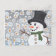 Cheerful snowman in a snowstorm of daisies and snowflakes. Snowman is smiling and waving, carrot nose, coal button eyes and smile, green scarf, and brown buttons. Blue-gray sky. Original artwork with acrylic paints.