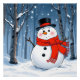 A jolly snowman stands proudly in a serene, snow-covered forest, wearing a bright red scarf and classic black hat. The tranquil winter scene captures the magic of the season, evoking feelings of warmth and holiday cheer.