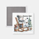 A whimsical snowman concludes his day by relaxing in a rocking chair, embodying the phrase 'Snowmen Rock'. He's busy with a twig, adorning a Christmas tree with ornaments. Next to him is a basket brimming with treats, all set against a wintry backdrop on this holiday magnet.