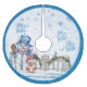A beautiful blue tree skirt for your Christmas tree featuring our adorable snowman with his cute fur-buddy wearing a Santa suit as they enjoy a snowfall.