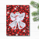 This winter postcard features a cute snowman making a snow angel on a red confetti heart background. -