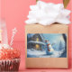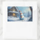 A pleasant, colorful, winter painting of a snowman outside a house.