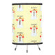 A lamp with a cut snowman wearing a floppy hat, red mittens and colorful scarf. The images, background and text can be personlaized. Original artwork by W.B.