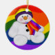 Cute hanging ornament of a little snowman in a rainbow pride hat and scarf on a rainbow background .. wonderful gift idea for Christmas from Ricaso