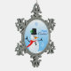 Snowman ornament features a cute snowman wearing a red scarf and a black hat on a fading blue background, who is enjoying the winter season as snowflakes of different shapes keep falling down. Ideal decoration for your Christmas tree. © Morning 6