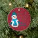 A sweet little snowman in blue hat, scarf and mittens. A red background makes him really stand out. Heart cheeks and a carrot nose. Pretty snowflakes. too.