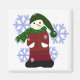 A cute snowman dressed for winter in a green hat and scarf. Red sweater and pants and black boots. Big blue snowflakes around him.