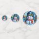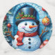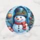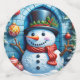 A cute snowman in front of a pretty Christmas decoration. With fir branches and Christmas ornaments.