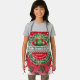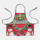 Great color and even though I ordered the kid size, it covers well enough to use during the holidays. I am not a big woman and prefer a shorter apron. I stand 5"6" and the length of the garment goes to mid-thigh. The tie straps fit well at my waist and even though there is no neck strap adjustment, the opening is plenty big enough. I am happy with the size and fit. I am sharing my apron with my 10 year old grandson, too! The color is vibrant and looks good, as shown on the website. The stitching looks strong and reinforced. Photographed is front side and back side of the apron, reinforced straps and coloring. My phone camera may not be the best at showing the details.