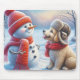 A cheerful snowman and an adorable puppy, both wearing warm winter attire, share a snowy moment under a pastel-colored sky
