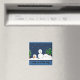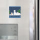 Cute snowman magnet. Little snowman in need of some help! Trees and snow background.