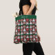 Cute snowmen in hats and scarves, interspersed with white flowers and branches on a green background, creates a fun collage that's perfect on this holiday tote bag. Personalize with your name in a green band at the top.