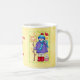 Enjoy hot chocolate, coffee, or your favorite beverage in this mug featuring a cute and whimsy snowman kid personalized with your or someone's name on a yellow background. The words "Snowmen Rule" and name can be easily customized. The snowman is wearing a turquoise and blue toboggan and scarf and a lavender purple sweater and is holding a sign that says "we rock". A redbird is flying close by and with stars are shining. A peppermint striped bucket holds a pile of snowballs. This design is original art by Phyllis Dobbs and comes on coordinating products in this /phyllisdobbs store. Fully customize for your event for Christmas or winter events.