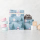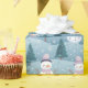 Scattered throughout the design, delicate snowflakes and green pine trees enhance the festive feel. The crisp white snowflakes create a frosty sparkle against the blue backdrop, while the pine trees add a natural, wintry touch that ties the entire design together beautifully.