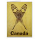 A crossed pair of snowshoes on a braintan leather background. Customizable text on the front reading "Canada" also appears. There are several different styles of traditional snowshoes. Those pictured here are made of Ash and moosehide babiche (webbing) in the Alaskan pattern. Longer and thinner than some other styles, such as the bearpaw, Alaskan snowshoes allow for a more natural gate and are well suited for cross-country travel. The slightly upturned tips allow you to drag your feet a bit. Be advised snowshoes can make for excellent skies; generally at the worst possible moment.
