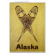 A crossed pair of snowshoes on a braintan leather background. Customizable text reading "Alaska" also appears. There are several different styles of traditional snowshoes. Those pictured here are made of Ash and moosehide babiche (webbing) in the Alaskan pattern. Longer and thinner than some other styles, such as the bearpaw, Alaskan snowshoes allow for a more natural gate and are well suited for cross-country travel. The slightly upturned tips allow you to drag your feet a bit. Be advised snowshoes can make for excellent skies; generally at the worst possible moment.
