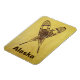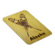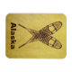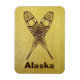 A crossed pair of snowshoes on a braintan leather background. Customizable text reading "Alaska" also appears. There are several different styles of traditional snowshoes. Those pictured here are made of Ash and moosehide babiche (webbing) in the Alaskan pattern. Longer and thinner than some other styles, such as the bearpaw, Alaskan snowshoes allow for a more natural gate and are well suited for cross-country travel. The slightly upturned tips allow you to drag your feet a bit. Be advised snowshoes can make for excellent skies; generally at the worst possible moment.