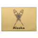 A crossed pair of snowshoes on a background color suggesting braintan leather. Customizable text reading "Alaska" also appears. There are several different styles of traditional snowshoes. Those pictured here are made of Ash and moosehide babiche (webbing) in the Alaskan pattern. Longer and thinner than some other styles, such as the bearpaw, Alaskan snowshoes allow for a more natural gate and are well suited for cross-country travel. The slightly upturned tips allow you to drag your feet a bit. Be advised snowshoes can make for excellent skies; generally at the worst possible moment.