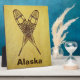 A crossed pair of snowshoes on a braintan leather background. Customizable text reading "Alaska" also appears. There are several different styles of traditional snowshoes. Those pictured here are made of Ash and moosehide babiche (webbing) in the Alaskan pattern. Longer and thinner than some other styles, such as the bearpaw, Alaskan snowshoes allow for a more natural gate and are well suited for cross-country travel. The slightly upturned tips allow you to drag your feet a bit. Be advised snowshoes can make for excellent skies; generally at the worst possible moment.