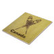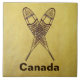 A crossed pair of snowshoes on a braintan leather background. Customizable text reading "Canada" also appears. There are several different styles of traditional snowshoes. Those pictured here are made of Ash and moosehide babiche (webbing) in the Alaskan pattern. Longer and thinner than some other styles, such as the bearpaw, Alaskan snowshoes allow for a more natural gate and are well suited for cross-country travel. The slightly upturned tips allow you to drag your feet a bit. Be advised snowshoes can make for excellent skies; generally at the worst possible moment.