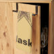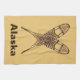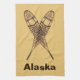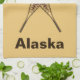 A crossed pair of snowshoes on a background color suggesting braintan leather. Customizable text reading "Alaska" also appears. There are several different styles of traditional snowshoes. Those pictured here are made of Ash and moosehide babiche (webbing) in the Alaskan pattern. Longer and thinner than some other styles, such as the bearpaw, Alaskan snowshoes allow for a more natural gate and are well suited for cross-country travel. The slightly upturned tips allow you to drag your feet a bit. Be advised snowshoes can make for excellent skies; generally at the worst possible moment.