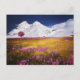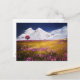 This postcard shows a view of the white, snowy Alps with a foreground meadow of pink flowers and golden grasses.