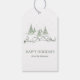 These minimalist Snowy Christmas Village Gift Tags features "Happy Holidays” in green on a white background. The name and greeting can be easily customized for a personal touch.