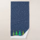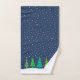 A modern geometric design of five fir trees in green, turquoise and golden yellow. The sky is navy with white falling snow.