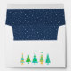 A row of geometric fir trees decorates the back of the envelope. The inside, shown on opening, is navy blue with snow. The snow is formed from simple dots to match the feel of the trees.