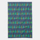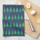 A modern geometric pattern of fir trees in teal, turquoise and golden yellow. The sky is navy with white falling snow.