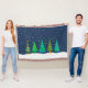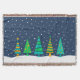 A modern geometric design of five fir trees in green, turquoise and golden yellow. The sky is navy with white falling snow.