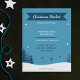 A charming Christmas Market Flyer in blue tones featuring a snowy landscape and its fir trees, some snowflakes and stars. Simply customize texts and use it for your local Xmas events. You can also use it as party invitation or dinner!