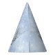 This adorable snowy winter Princess party hat features a beautiful young princess with Black hair wearing a blue and white snowflake gown and warm fur lined cape. The princess is surrounded by poinsettias.