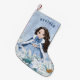 This adorable snowy winter Princess stocking features a beautiful young princess with black hair wearing a blue and white snowflake gown and warm fur lined cape. The princess is surrounded by poinsettias. You can personalize with your princess's name!