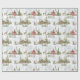 This Christmas wrapping paper features snow covered log cabins and red A-frame cabins with deer and reindeers in the snow.