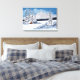A canvas print with a beautiful winter scene including snowy mountains, rustic cabin and snow covered evergreens. Original artwork by W.B.