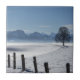 Stunning snowy landscape with gently sloping hills and fields contrasting with the jagged mountains in the distance.
