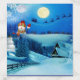 A teal & dark blue snowy star background with a snowman and a flying Santa on his sleigh sending reindeer through the sky fantasy scene