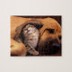 Game puzzle shown with a photo print of a cute kitten and dog being snuggle pals. Customize this item or buy as is. Stock Image
