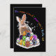 So egg-cited I just can’t hide it! Curious, cute and funny Easter Bunny or Easter Rabbit peeking behind a pile of painted decorated or ornate Easter Eggs for Easter Egg Hunt with pun phrase